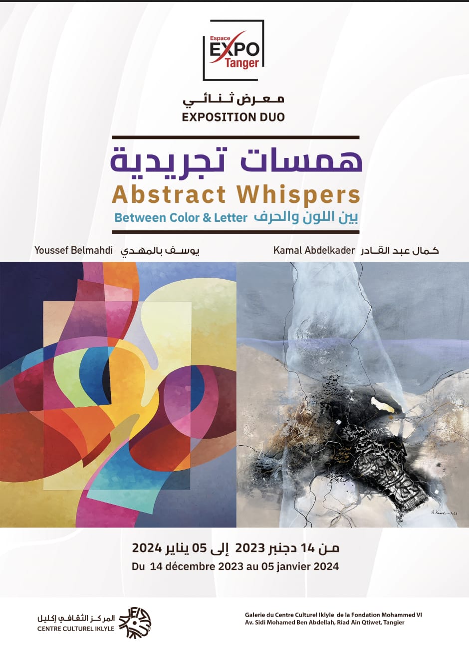 يقدم الفنانين التشكيليين يوسف بالمهدي وعبد القادر كمال، في الفترة من 14 دجنبر 2023 إلى 5 يناير 2024، معرضهما الثنائي “همسات تجريدية” الذي يقدمان من خلاله آخر نتاج بحثيهما الفنيين في ما يخص الخط واللون وعلاقتهما ببعضهما البعض فنيّا.