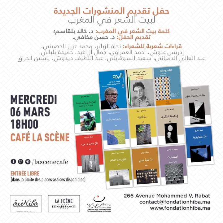 ينظم بيت الشعر في المغرب حفل تقديم منشوراته الجديدة التي حظيت بالدعم برسم سنة 2023 صمن برنامج دعم النشر والكتاب الذي ترعاه وزارة الشباب و الثقافة والاتصال (قطاع الثقافة)، وذلك يوم الأربعاء 6 مارس 2024 في الساعة السادسة مساء بفضاء المقهى الثقافي لسينما النهضة بشارع محمد الخامس بالرباط.