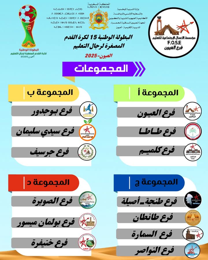 تحتضن مدينة العيون فعاليات الدورة 15 للبطولة الوطنية لكرة القدم المصغرة لرجال التعليم، التي سينظمها الفرع الإقليمي لمؤسسة الأعمال الاجتماعية للتعليم بالعيون من 4 إلى 9 ماي الجاري، في إطار احتفالات الشعب المغربي المخلدة للذكرى الخمسين لانطلاق المسيرة الخضراء المظفرة.