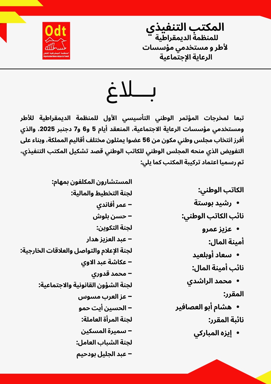 انعقد المؤتمر الوطني التأسيسي للمنظمة الديمقراطية لأطر ومستخدمي مؤسسات الرعاية الاجتماعية العضو في المنظمة الديمقراطية للشغل أيام 5 و6 و7 دجنبر 2025 بمركز العاليا – المنظر الجميل بمدينة المحمدية، في سياق وطني ودولي يتسم بتحديات اجتماعية واقتصادية عميقة، وباختلالات بنيوية تمس قطاع الرعاية الاجتماعية، وتنعكس بشكل مباشر على أوضاع الفئات الهشة، وعلى الحقوق المهنية والاجتماعية للأطر والمستخدمين العاملين بهذه المؤسسات.