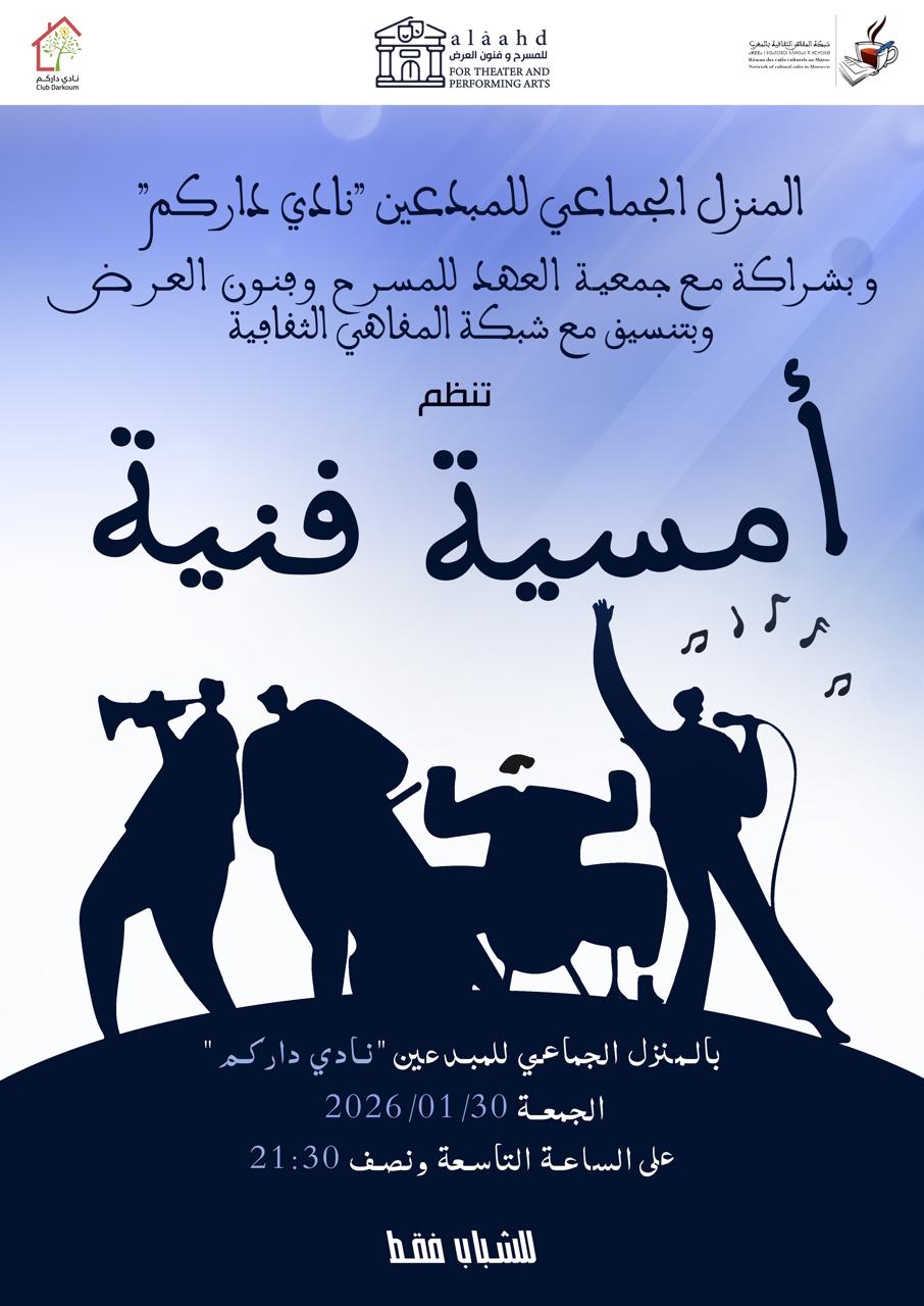 ينظم المنزل الجماعي “نادي داركم “، بشراكة مع جمعية العهد للمسرح وفنون العرض ، وبتنسيق مع شبكة المقاهي الثقافية بالمغرب ، أمسية فنية خاصة بالشباب بنادي داركم بمدينة قلعة السراغنة، وذلك يوم الجمعة 30 يناير 2026 في الساعة التاسعة والنصف ليلا.