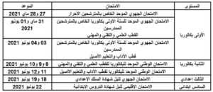 أعلنت وزارة التربية الوطنية والتكوين المهني والتعليم العالي والبحث العلمي، قطاع التربية الوطنية، أنه نظرا للوضعية الاستثنائية التي تعرفها منظومتنا التربوية، منذ انطلاق الموسم الدراسي الحالي والناتجة عن اتخاذ تدابير تربوية واحترازية للوقاية من تفشي جائحة كوفيد – 19، وذلك حفاظا على صحة وسلامة التلميذات والتلاميذ والأطر التربوية والإدارية، فإن الامتحانات المدرسية الإشهادية الخاصة بالأسلاك التعليمية الثلاثة (الثانوي التأهيلي والإعدادي والابتدائي) برسم دورة 2021 ستجرى في المواعد التالية.