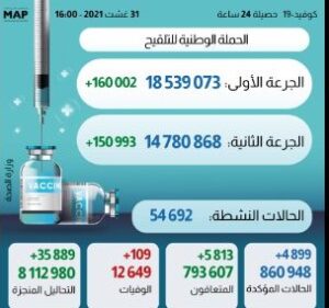 الرباط – أعلنت وزارة الصحة، اليوم الثلاثاء، عن تسجيل 4899 إصابة جديدة ب(كوفيد-19) و5813 حالة شفاء و109 وفيات خلال ال24 ساعة الماضية.