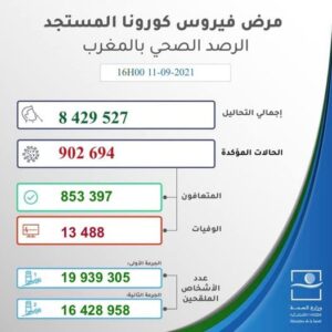 ورفعت الحصيلة الجديدة للإصابات بالفيروس العدد الإجمالي لحالات الإصابة المؤكدة بالمملكة إلى 902 ألف و694 حالة منذ الإعلان عن أول حالة في 2 مارس 2020، فيما بلغ مجموع حالات الشفاء التام 853 ألف و397 ألف بنسبة تعاف تبلغ 94,5 في المائة، بينما ارتفع عدد الوفيات إلى 13 ألف و488 وفاة بنسبة فتك قدرها 1,5 في المائة.
