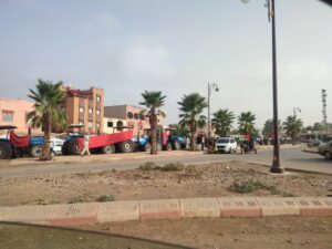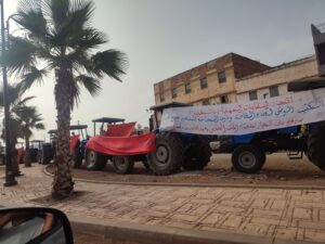 اصطف عشرات الجرارات والشاحنات على جنبات الطريق الرئيسية في المعازيز في ما اعتبر وقفة احتجاجية للفلاحين للحصول على الدعم لمواجهة غلاء الاسعار واستمرار غلاء الكازوال . ويعاني الفلاحون في هذه المنطقة المعروفة باشجار الزيتون و الفلاحة بكل انواعها . حيث انه يتم كراء الجرار ب 350 درهم للساعة وهو ما يشكل عبئا ثقيلا على فلاحي المنطقة . لذلك أوقفوا جرارتهم وشاحناتهم في انتظار التوصل بالدعم المالي ليواجهوا بها غلاء الاسعار .