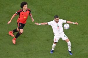 Belgium’s midfielder #06 Axel Witsel (L) and Morocco’s midfielder #07 Hakim Ziyech fight for the ball during the Qatar 2022 World Cup Group F football match between Belgium and Morocco at the Al-Thumama Stadium in Doha on November 27, 2022. (Photo by Kirill KUDRYAVTSEV / AFP)