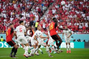 Belgium’s Amadou Onana heads the ball during the World Cup group F soccer match between Belgium and Morocco, at the Al Thumama Stadium in Doha, Qatar, Sunday, Nov. 27, 2022. (AP Photo/Christophe Ena)