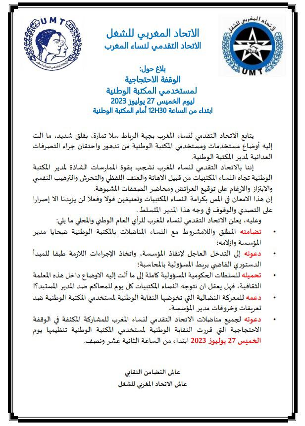 هذا، وإذ تؤكد النقابة الوطنية على استعدادها التام لمواجهة كل أساليب و أشكال التعسف والتضييق على العمل النقابي، فإنها تهيب بمستخدمات ومستخدمي المكتبة الوطنية وكافة مكونات الاتحاد المغربي للشغل، والجمعيات النساءية والحقوقية، وباقي الغيورين على هذه المعلمة الثقافية العريقة إلى الحضور والمشاركة بكثافة في هذه المحطة النضالية الهامة في مسار انقاذ المكتبة الوطنية من الانهيار.