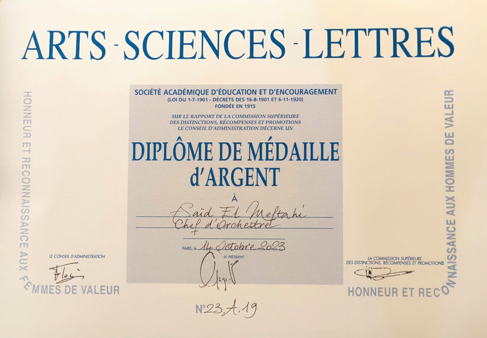 توج المجتمع الأكاديمي للتربية والفنون بباريس سفير فن الملحون بالديار الأوروبية الأستاذ سعيد المفتاحي بالميدالية الفضية مع منحه دبلوم الأكاديمية مع كتيب على مساره الفني الذي يبلغ أزيد من أربعة عقود .ويعتبر الفنان سعيد المفتاحي أول مغربي يمنح هذه الجائزة القيمة.