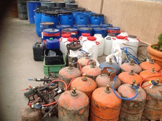 بالإضافة إلى العديد من الآليات والأواني والأنابيب والبراميل وقنينات الغاز المستعملة في عملية تقطير وصنع الماحيا.